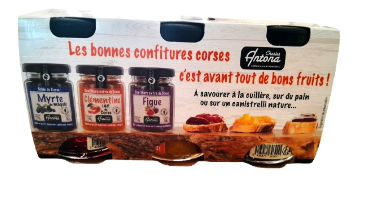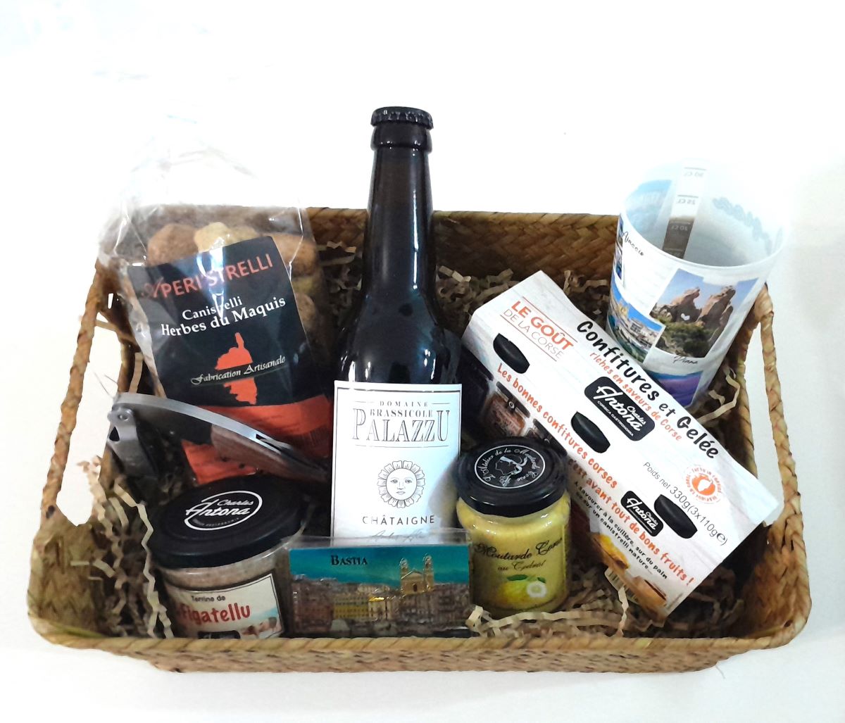 Contenu : 1 bière Palazzu de 33 cl, 3 pots de confitures ( myrte, clémentine et figue)de 110 g , 1 pot de moutarde au cédrat de 100g, 1 terrine de sanglier au Figatellu de 100 g,  1 sachet de Canistrelli aux herbes du maquis de 200 g, 1 limonadier, 1 magnet en métal de Bastia et 1 verre doseur Carte postale.