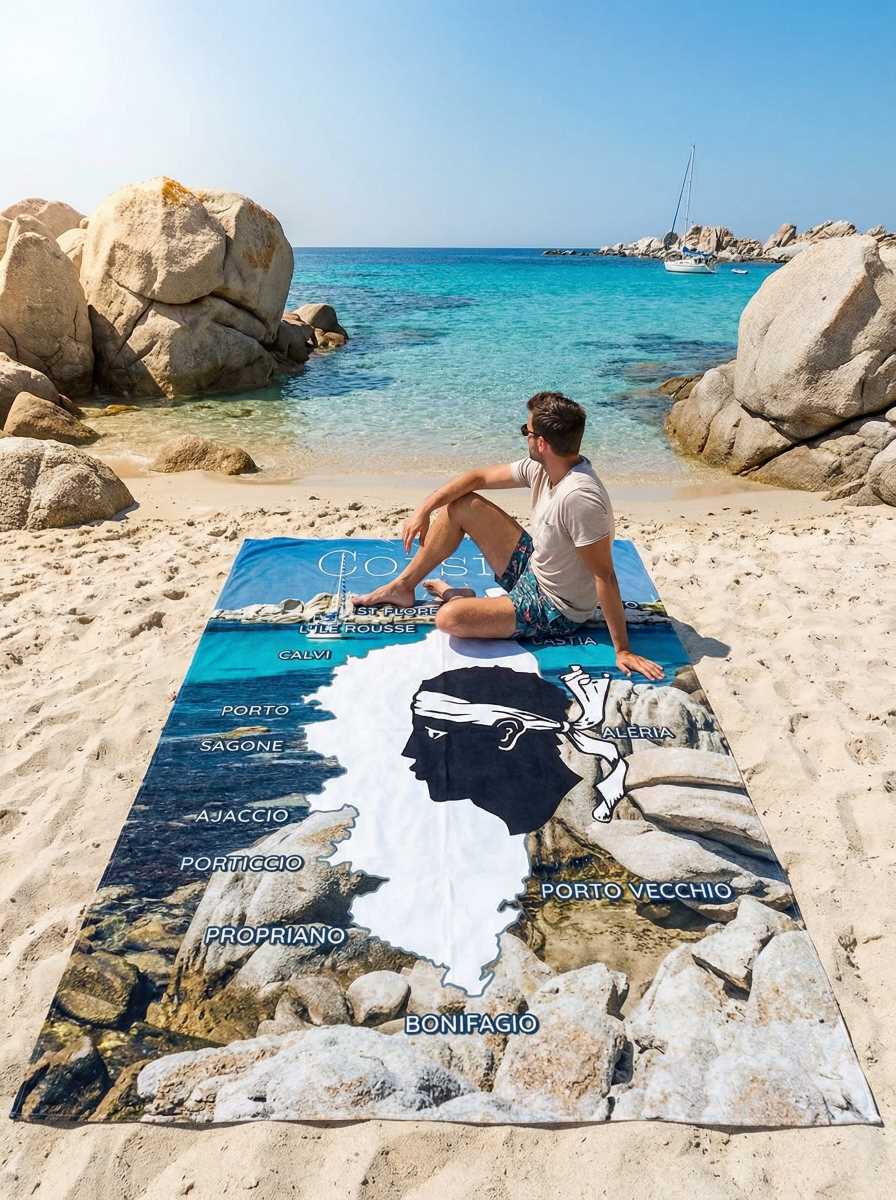 Évadez-vous sur les plages de Corse grâce au Drap de plage Lavezzi « double ». Non seulement il vous offre un espace douillet pour vous détendre, mais il arbore également un motif inspiré des eaux turquoises qui bordent l’île. Fabriqué dans une matière de qualité, cette serviette est à la fois absorbant et résistant. Qui plus est, son design, orné de la tête de Maure, symbole incontournable de la Corse, lui confère une élégance intemporelle. Ainsi, ce drap Lavezzi est bien plus qu’un simple accessoire : c’est un véritable hommage à la beauté de l’île.