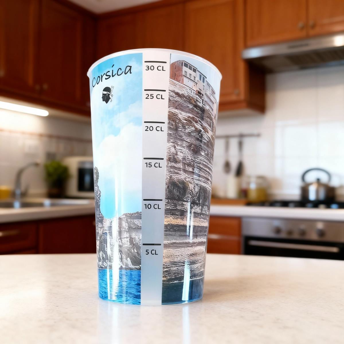 Le verre doseur Bonifacio falaise vous transporte visuellement sur les falaises Corses. En effet, ces falaises, réputées pour leur hauteur vertigineuse et leur calcaire blanc éclatant, contrastent magnifiquement avec le bleu profond de la Méditerranée. De même, le verre doseur en plastique, tout en étant un objet du quotidien, vous offre une fenêtre sur cette beauté naturelle. Ainsi, il devient bien plus qu’un simple ustensile de cuisine : c’est un souvenir décoratif qui évoque les paysages époustouflants de Bonifacio.